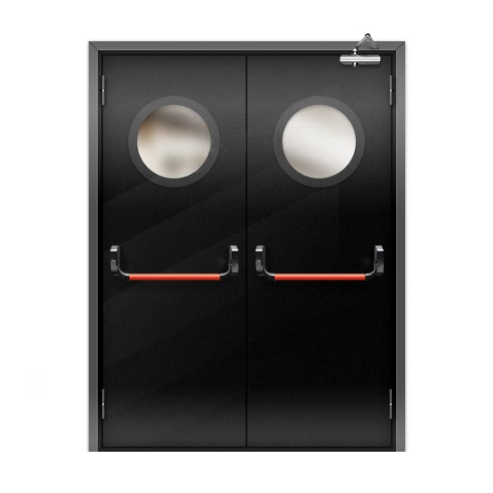 Дверь противопожарная без порога полуторная с квадратным стеклом
