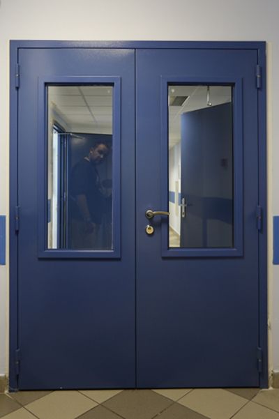 Противопожарная алюминиевая дверь синего цвета в Электростали